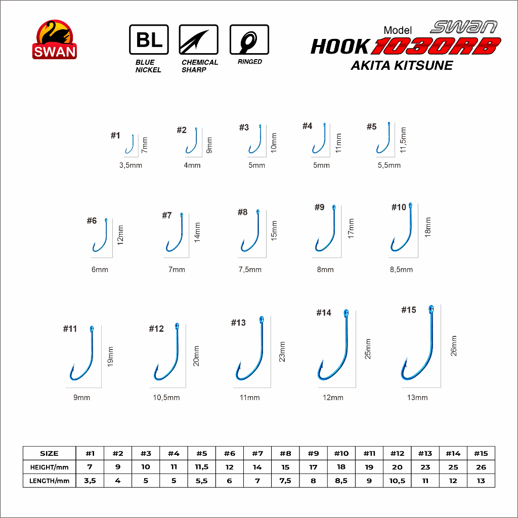 Hook/Kail Pancing Kotak Mika Swan AkitaKitsune Blue 1030RB, No 1(kecil) - 15(Besar), Kail Biru