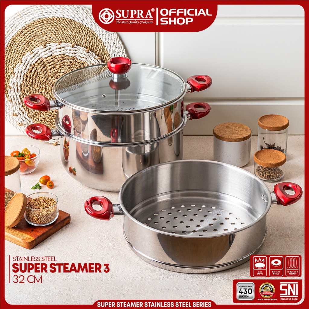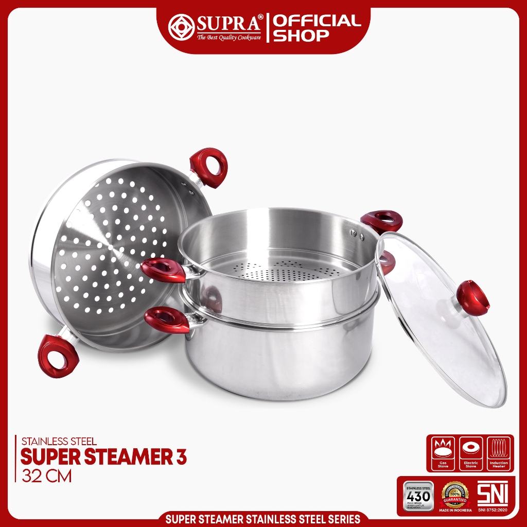 Panci Kukus Tingkat SUPRA Panci Stainless Super Steamer Susun 3 32 Cm Red Panci Anti Lengket