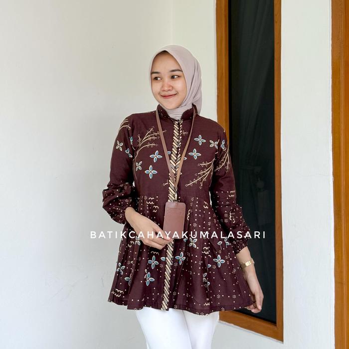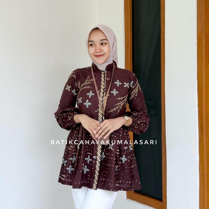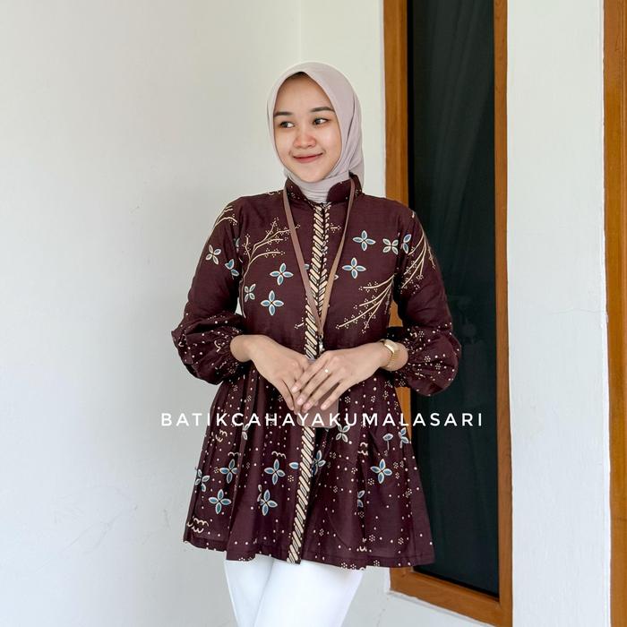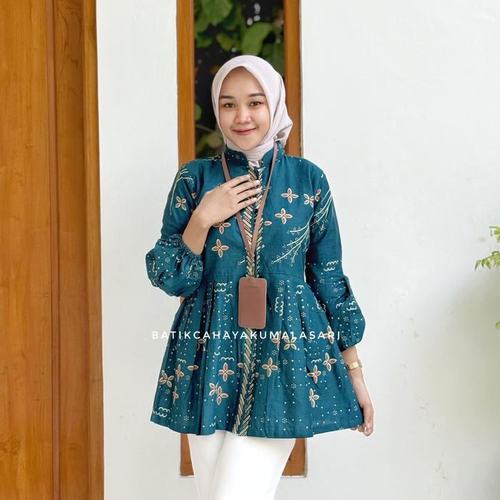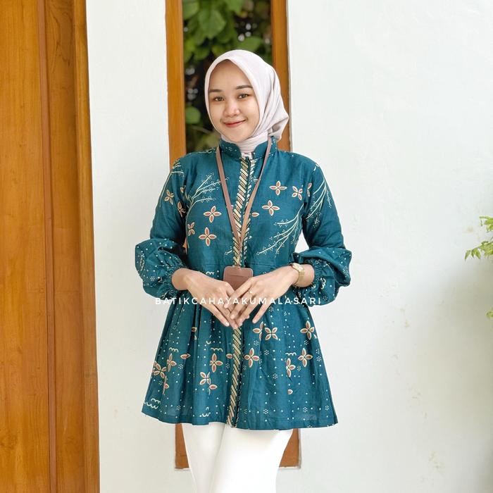 BLOUSE BATIK WANITA LENGAN BALON MOTIF ARRUNA - BAJU KERJA WANITA BAHAN KATUN PRIMA SOLO ATASAN MUSLIM - HIJAU EMERALD, S