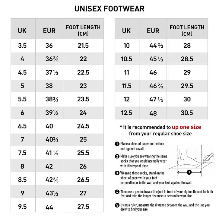 UK:3.5/EUR: 36, UK:5/EUR: 38, UK:6.5/EUR: 40, UK:8/EUR: 42, UK:9.5/EUR: 44, UK:11/EUR: 46, UK:4/EUR: 36 2/3, UK:5.5/EUR: 38 2/3, UK:7/EUR: 40 2/3, UK:8.5/EUR: 42 2/3, UK:10/EUR: 44 2/3, UK:11.5/EUR: 46 2/3, UK:4.5/EUR: 37 1/3, UK:6/EUR: 39 1/3, UK:7.5/EUR: 41 1/3, UK:9/EUR: 43 1/3, UK:10.5/EUR: 45 1/3