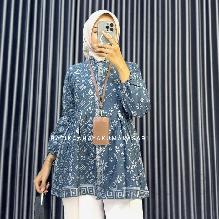 BLOUSE BATIK WANITA LENGAN BALON MOTIF ROMECCA - BAJU KERJA WANITA BAHAN KATUN PRIMA - BLUE DENIM, S