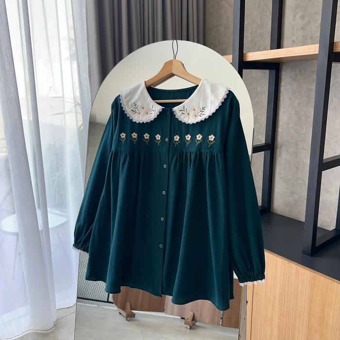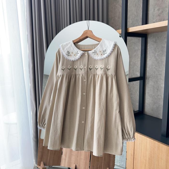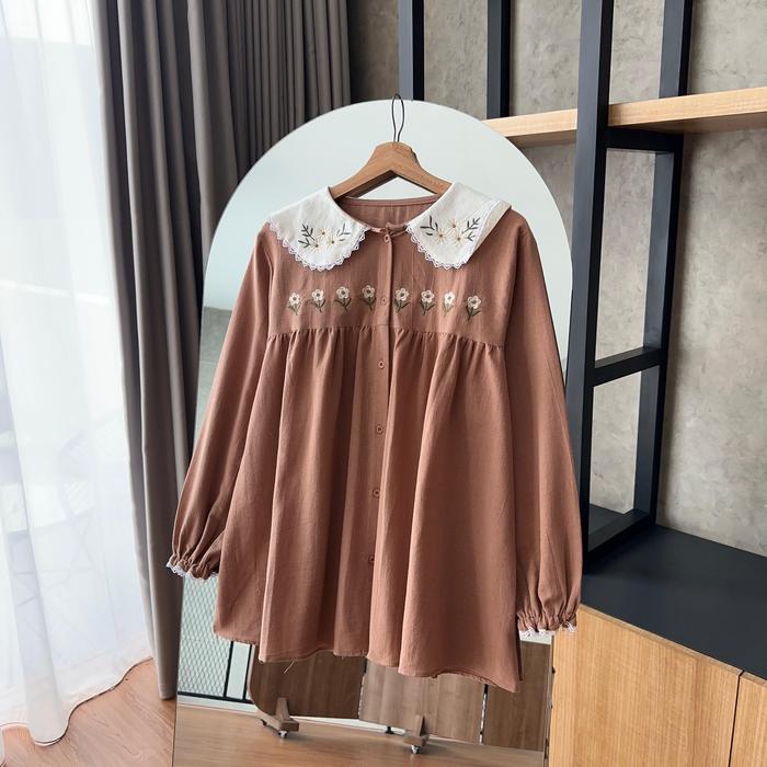 BY.HANA 417 | KEMEJA REMPEL POLOS BORDIR BLOUSE KOREAN ATASAN WANITA - MOCCA (LINEN ANGEL), XL