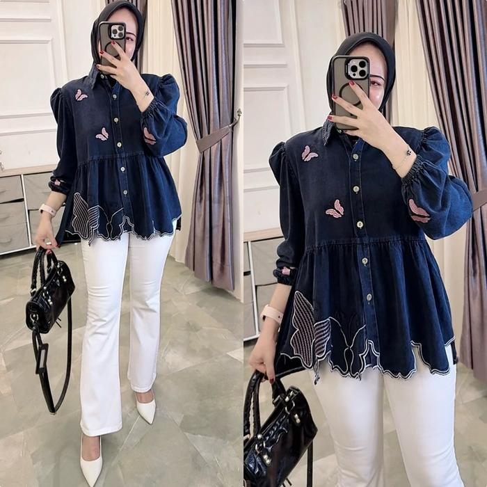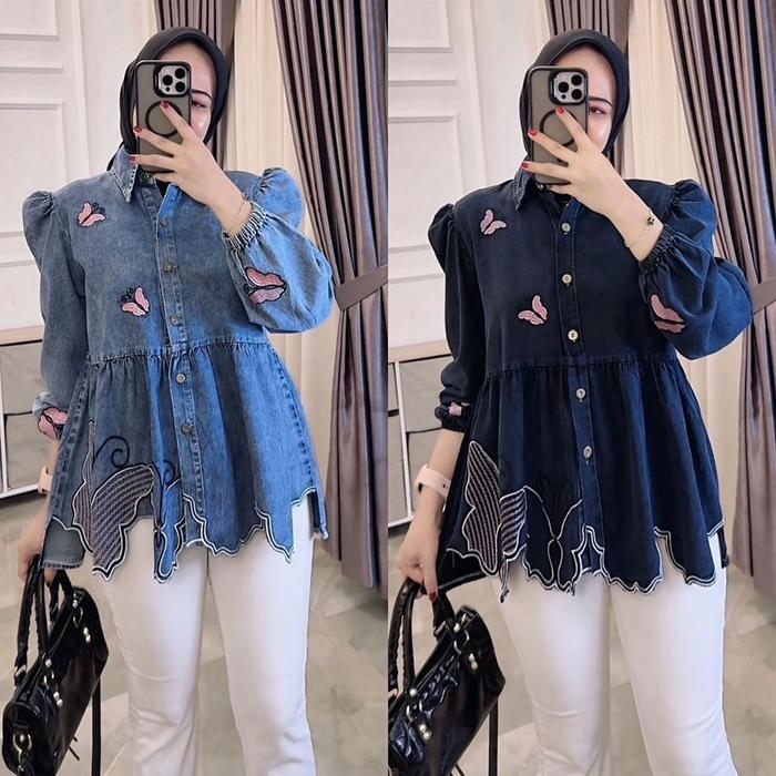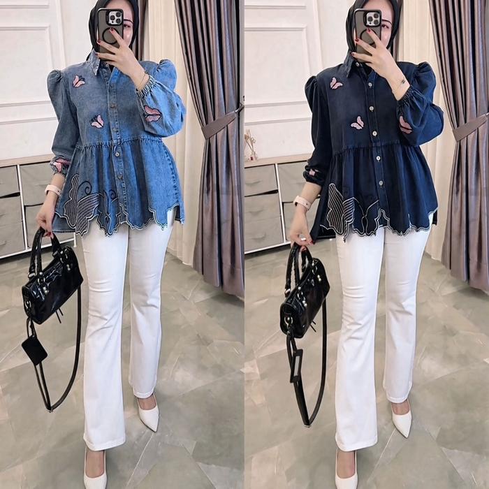ARIE NAMIA BLOUSE JEANS WANITA ARIE NAMIA – BORDIR ELEGAN, BAHAN JEANS PREMIUM, BUSUI FRIENDLY, DESAIN KEKINIAN, PUFF SLEEVE, RUFFLE, WARNA SNOW BLUE & SNOW BLACK ATASAN BAJU CEWEK CASUAL - SNOW BLUE