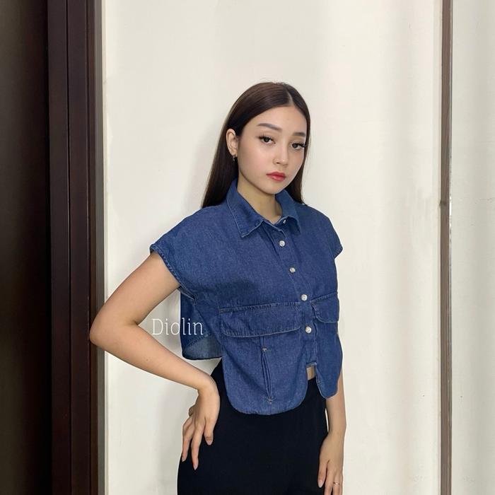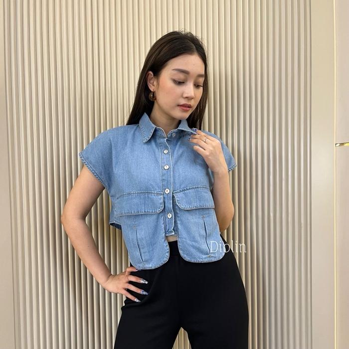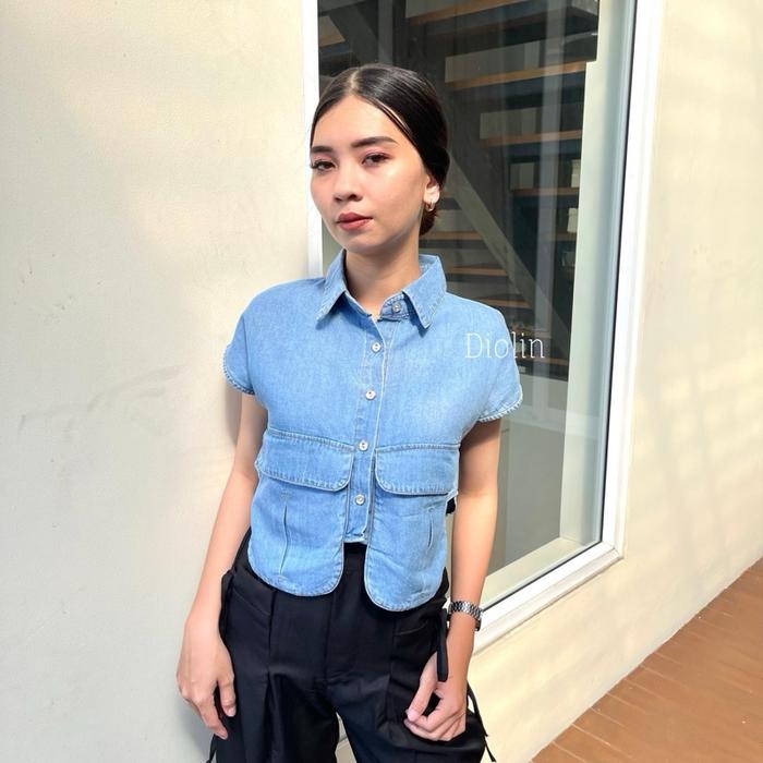DIOLIN - YURA - BAJU WANITA KEKINIAN ATASAN KEMEJA WANITA OUTFIT CROP JEANS FASHION LENGAN PENDEK KANTONG CARGO - LIGHT BLUE, M
