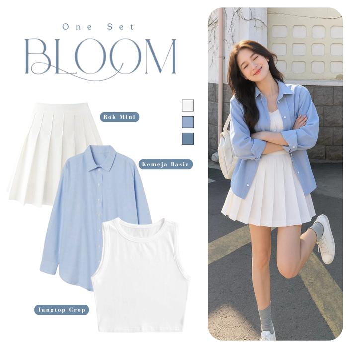 ONE SET BLOOM 3IN1 (KEMEJA BASIC ROK MINI TANKTOP CROP) GAYA KOREAN GIRL SIMPLE & STYLISH SO2A30 - FULL SET