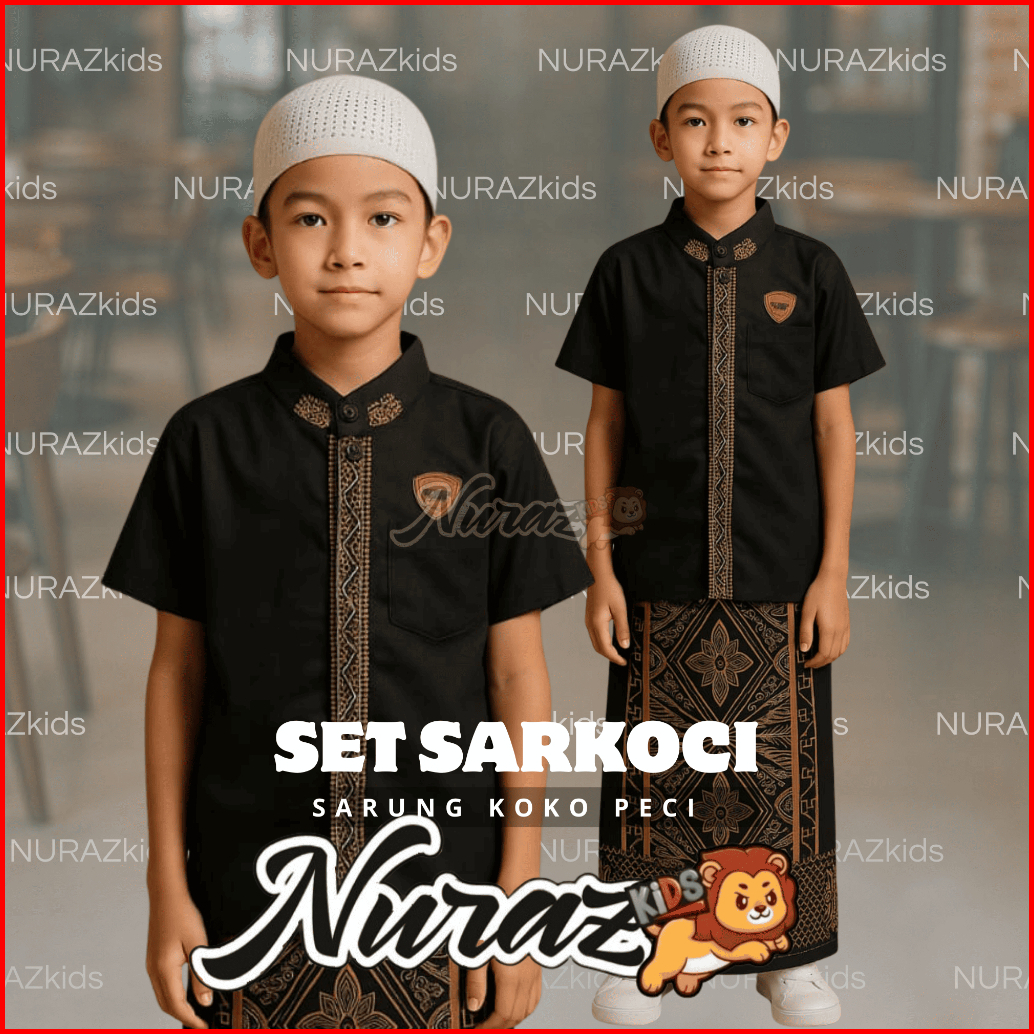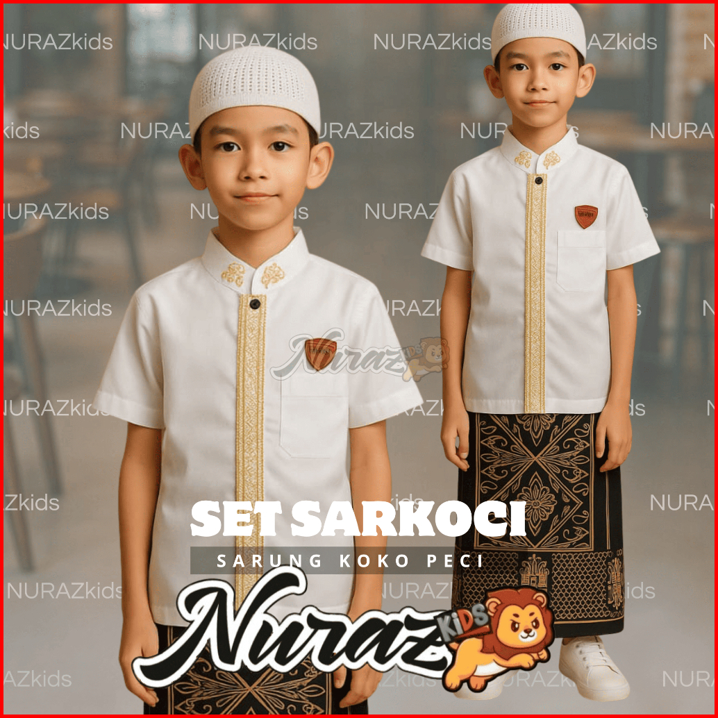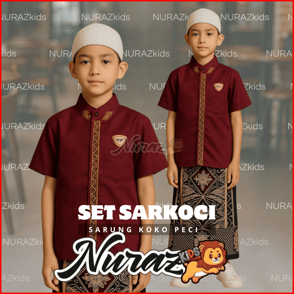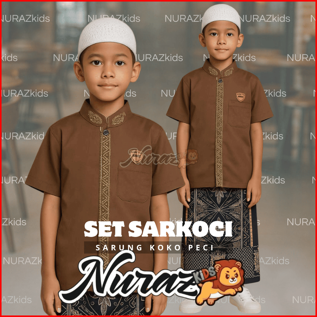 Nuraz Kids Sarkoci Sarung Koko Peci Anak Usia 1-10 Tahun Baju Bordir Motif Muslim Nyaman Peci Setelan Lembut Panjang Kok