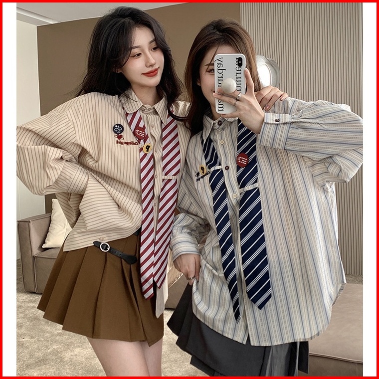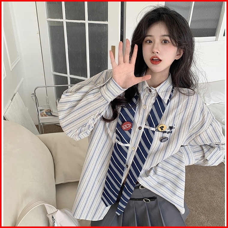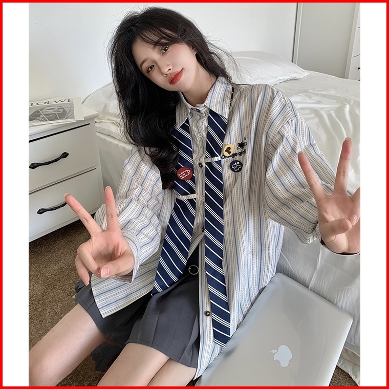 Rosella Lengan Panjang Atasan Kemeja Longgar Gaya Korea Stripe Kemeja Wanita Bonus Dasi Lencana