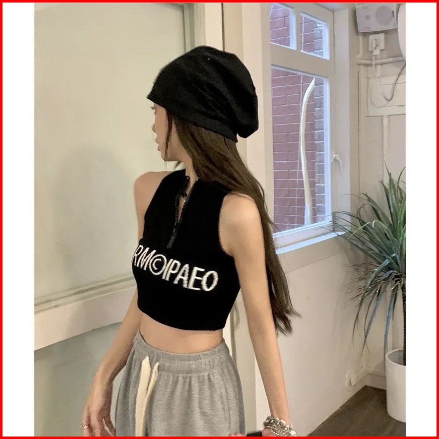 Brasay Atasan Tanktop Wanita Halter Knit Zip Crop Top Atasan Wanita Tanpa Lengan 4092