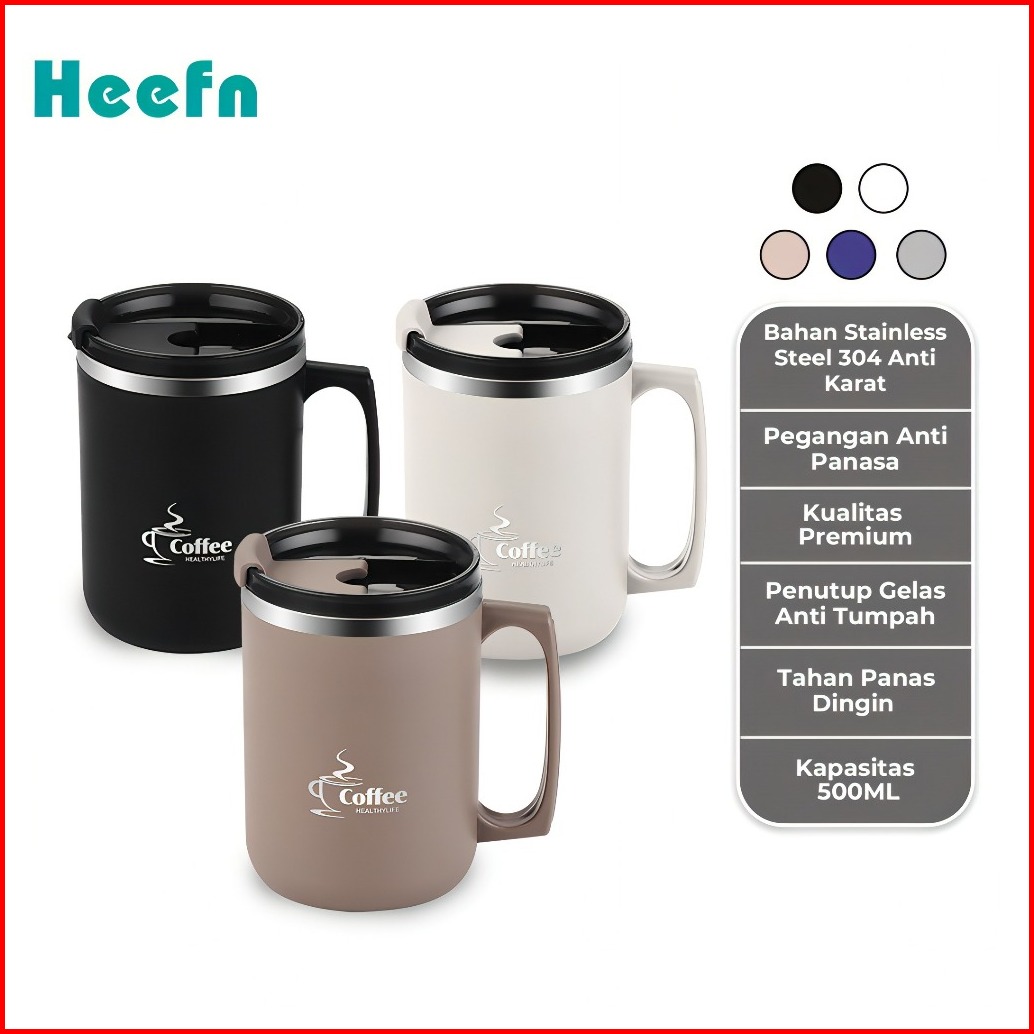Heefn 500ml Gelas Stainless Gelas Kopi Teh Mug Coffee Tahan Panas Dingin Anti Tumpah