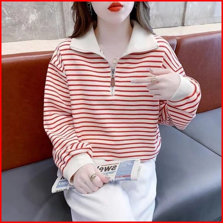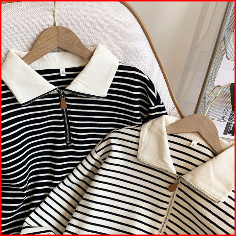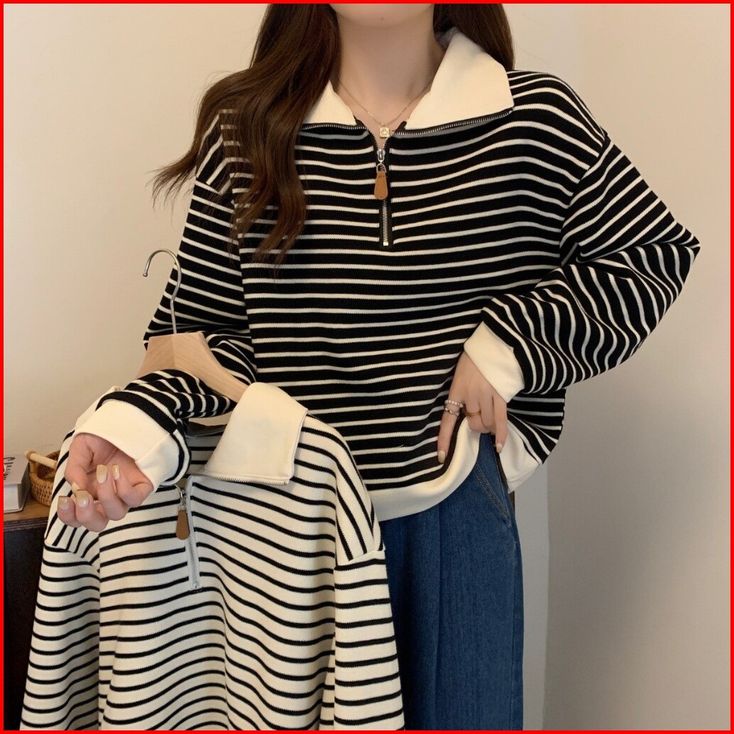 Brasay Knitwear Kaos Sweater Kerah Wanita Lengan Panjang Zip Rajut Sreetwear Garis Sweater Wanita Premium 4130