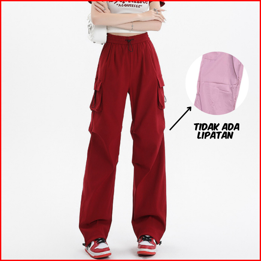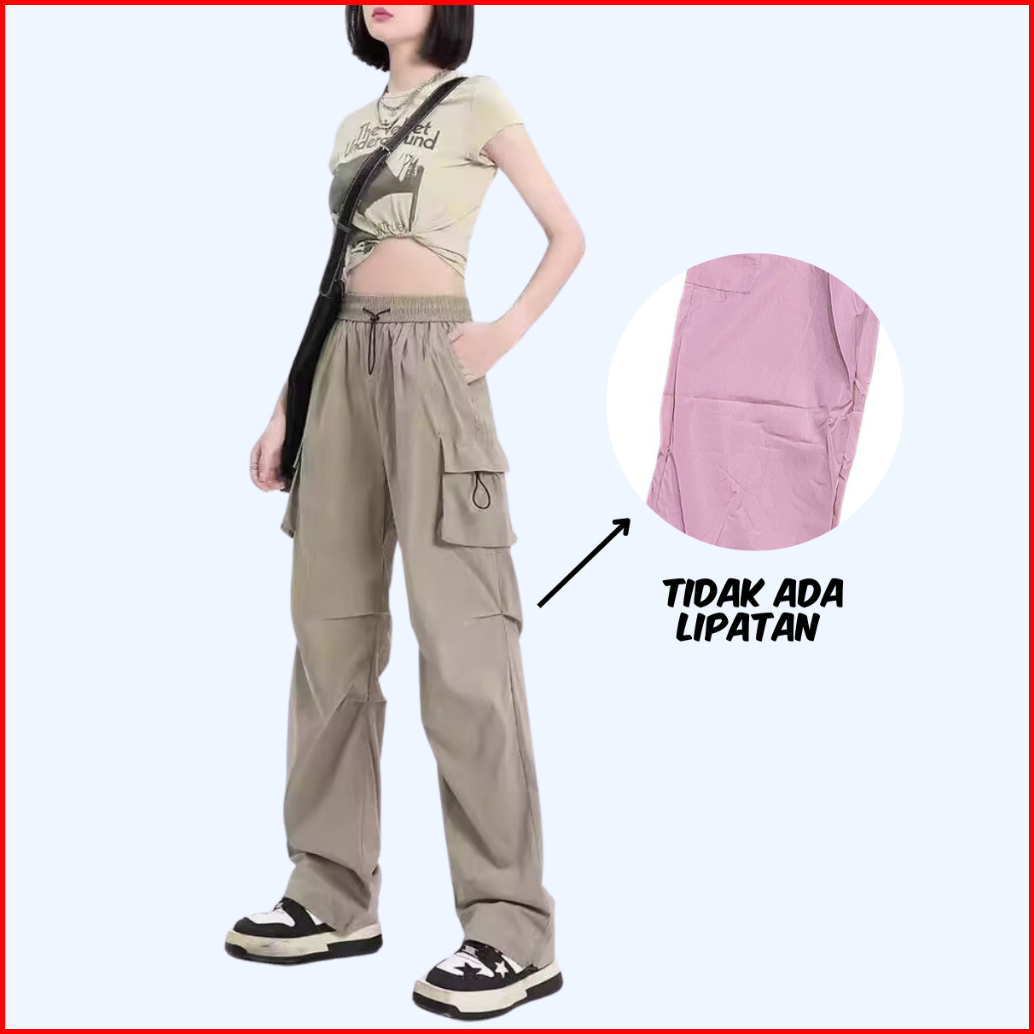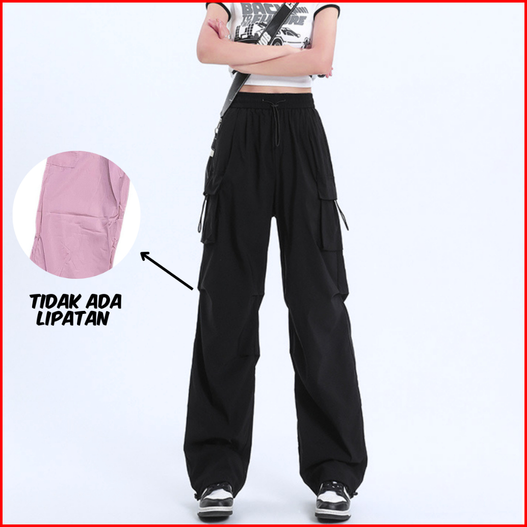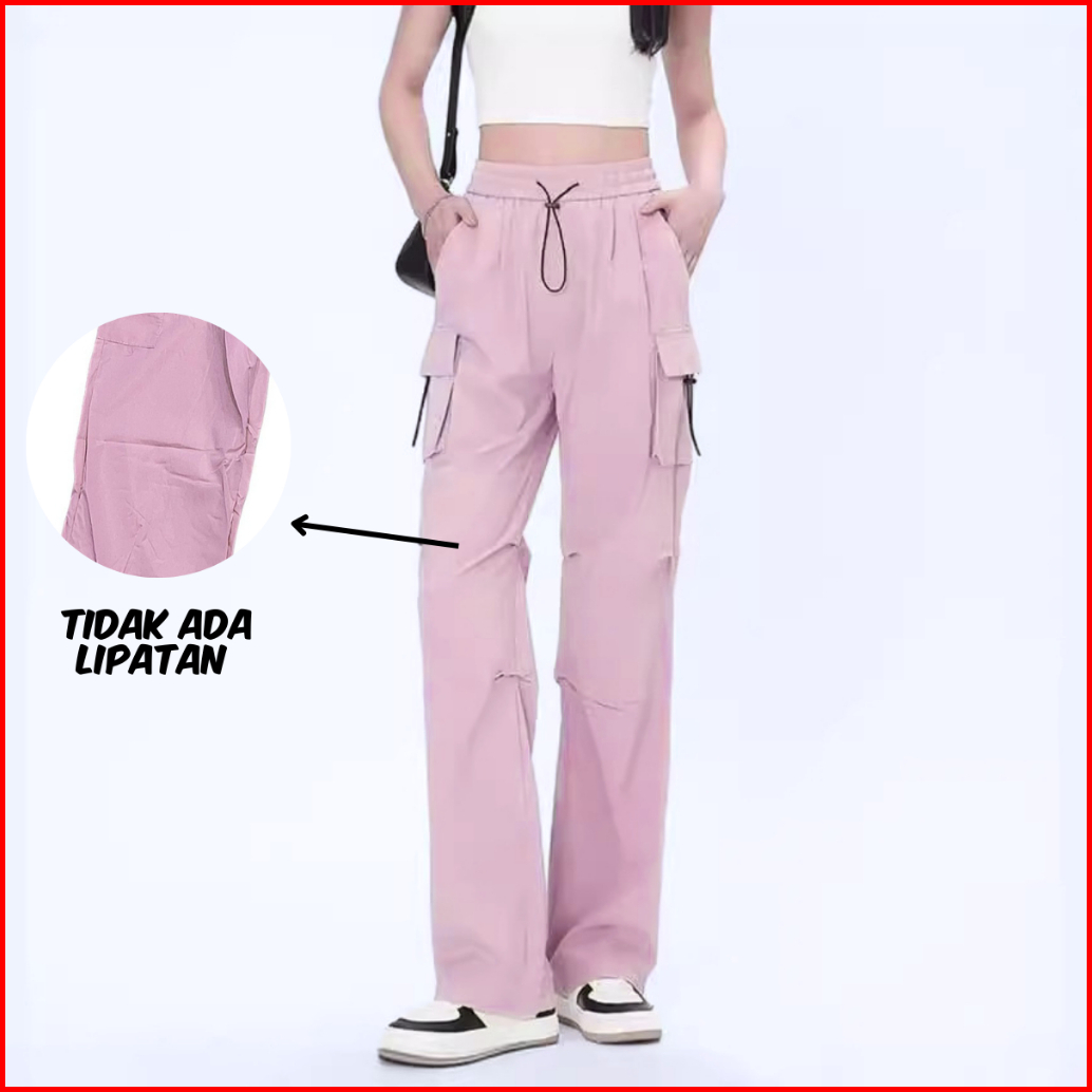 Brasay Celana Kasual Wanita Harajuku Kargo Stretwear Wanita Premium Highwaist Polos Casual Serut Oversize 4114