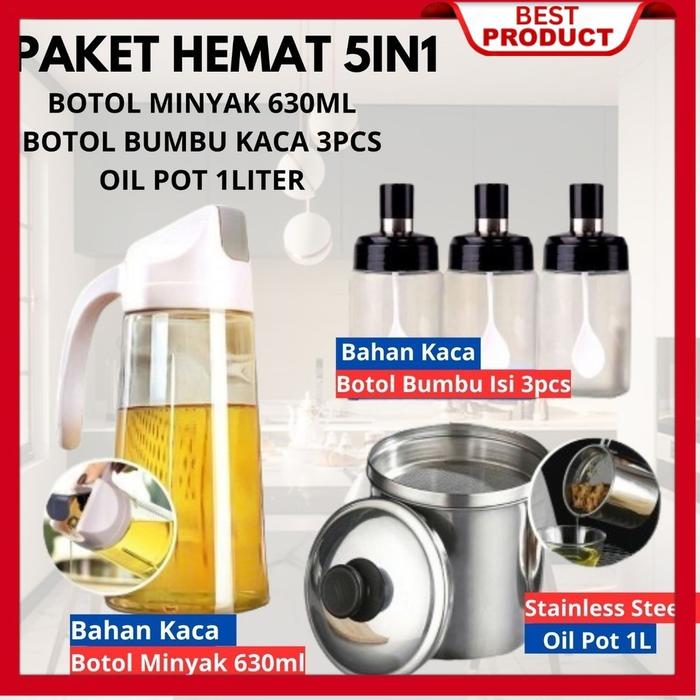 PAKET HEMAT 5IN1 botol minyak kaca +oilpot +toples bumbu kaca 3pcs Stainless Steel