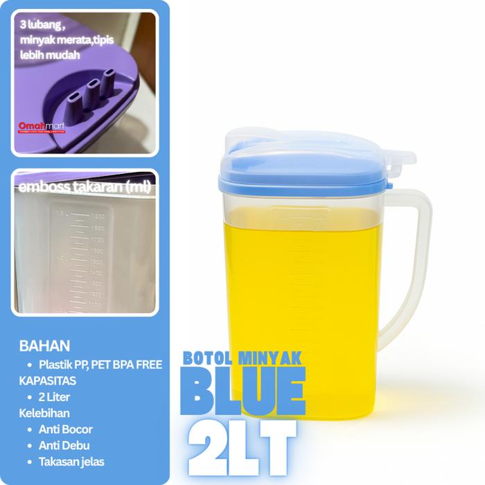 Tempat botol Minyak Goreng 2 Liter dengan Takaran anti tumpah dan Debu Plastik BPA FREE - Transparan Blue 2ltr