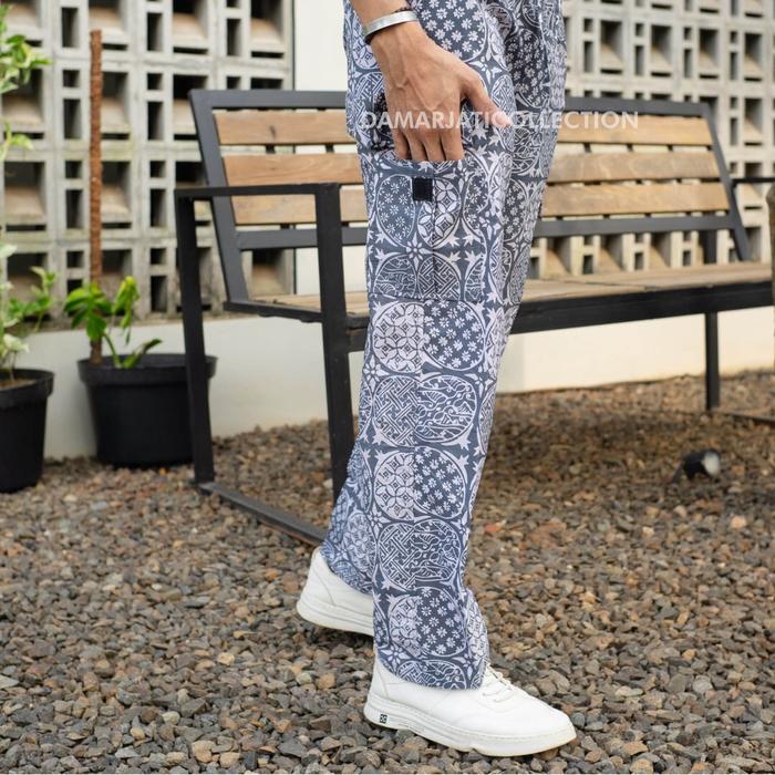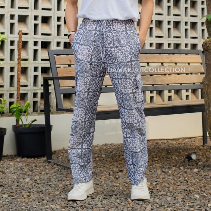CELANA SANTAI KARET KATUN ASLI HANDMADE DENGAN CELANA BATIK BOIM CARGO MOTIF ABSTRAK, SAKU DEPAN DAN SAMPING - SIZE L DAN XL TERSEDIA - MOTIF BULAT, L (BB 40-70 KG)
