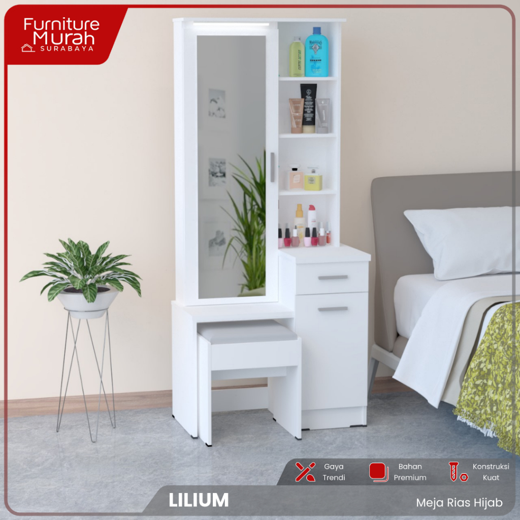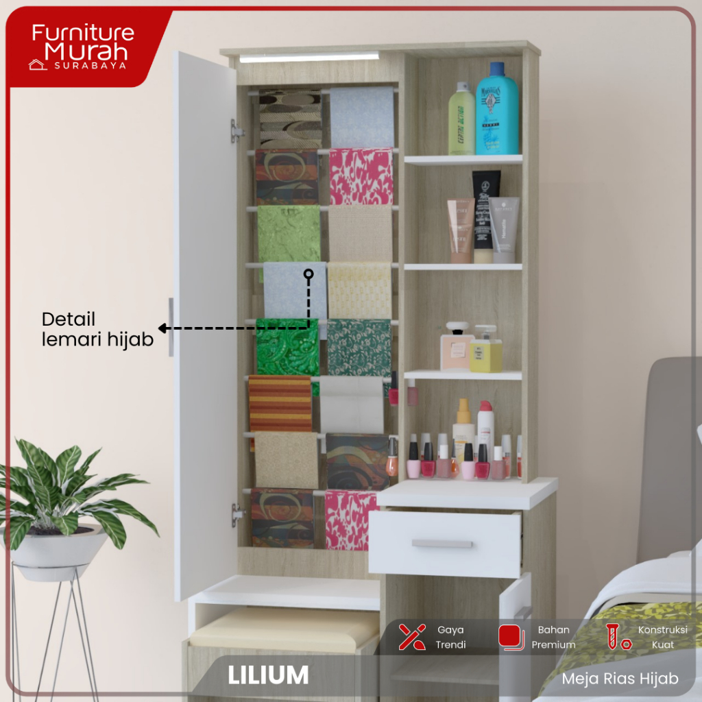 Furniture Murah Surabaya - Meja Rias Hijab Minimalis LED dengan Rak Hijab dan Kursi Meja Rias Multifungsi Meja Rias Aest