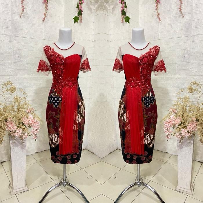 MIDI DRESS BATIK STRECTH MERAH CABE KOMBINASI TILE//DRESS PESTA WANITA // UNTUK MOTIF BATIK BISA KONFIRMASI KE ADMIN YA KA KARENA STOCK MOTIF SELALU UPDATE - S