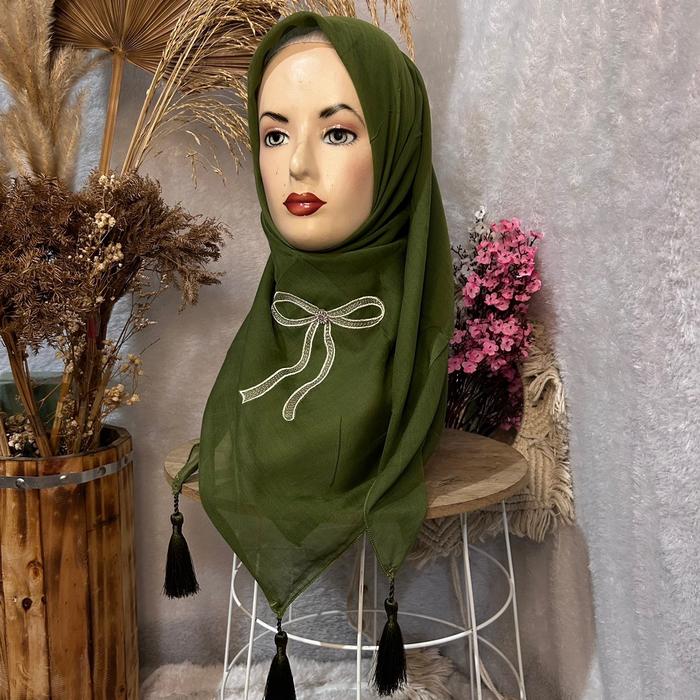 Hijab segi empat paris jadul motif bordir pita jambul - Hitam