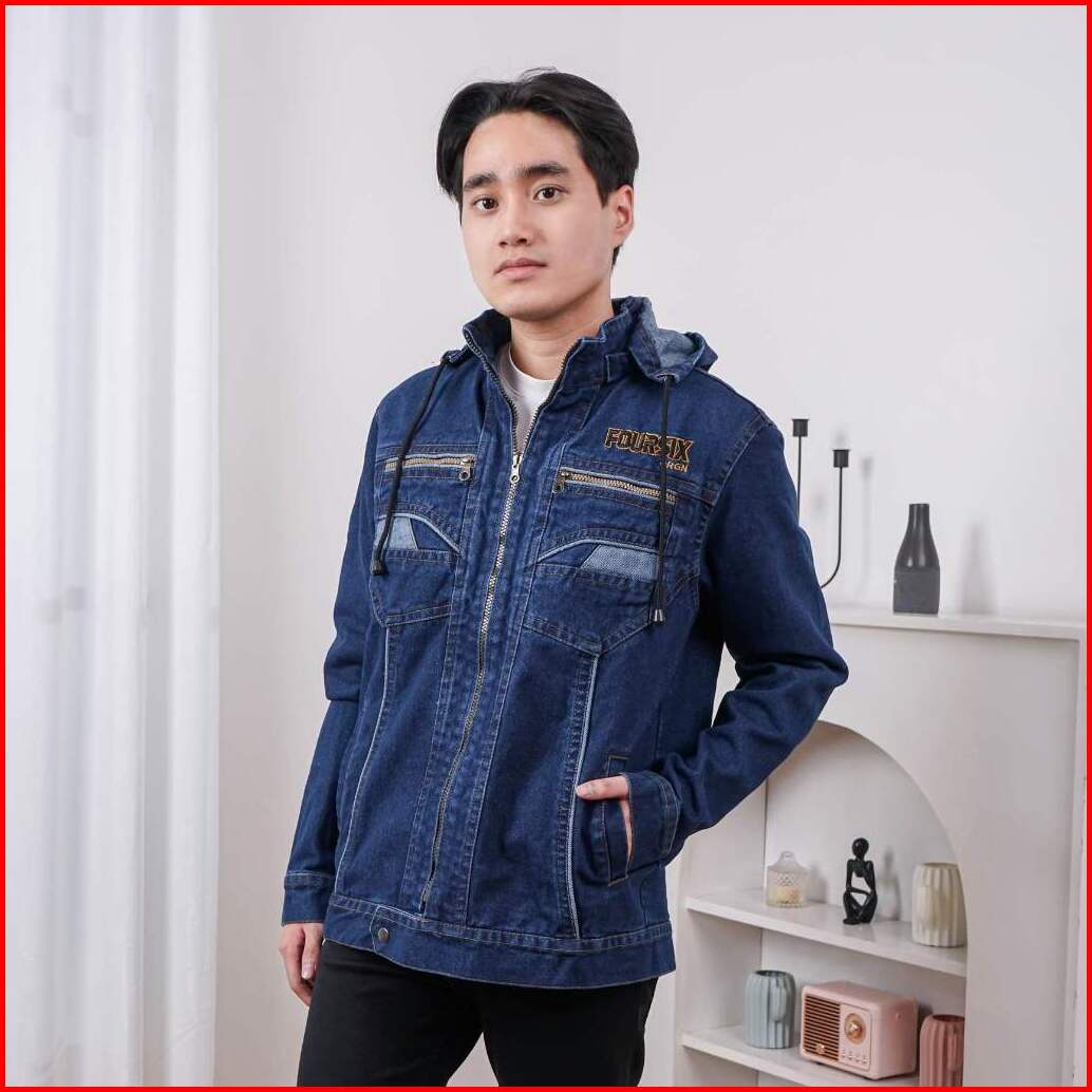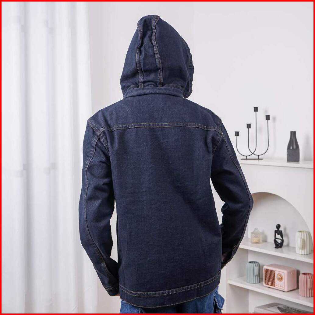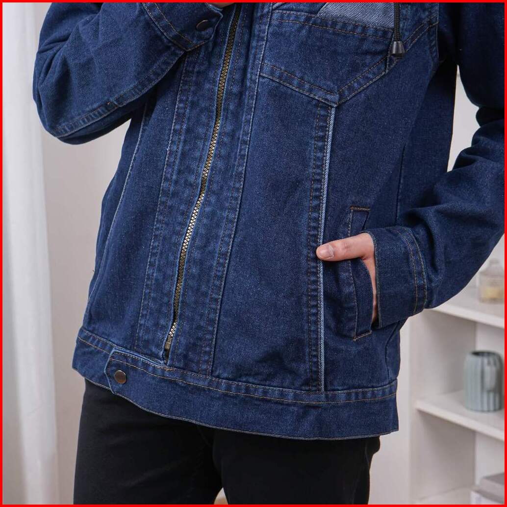 Jaket Jeans Pria Cowok Casual Memakai Topi Kupluk Motif Bordir Resleting Bahan Denim