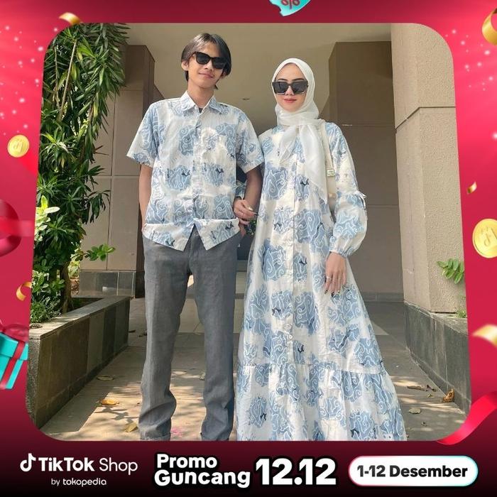 BATIK TRUSMI SET COUPLE DRESS DAN KEMEJA BATIK MOTIF MEGA MENDUNG BUMI PITA BIRU KATUN BAJU PASANGAN SARIMBIT KELUARGA KONDANGAN - M, GAMIS