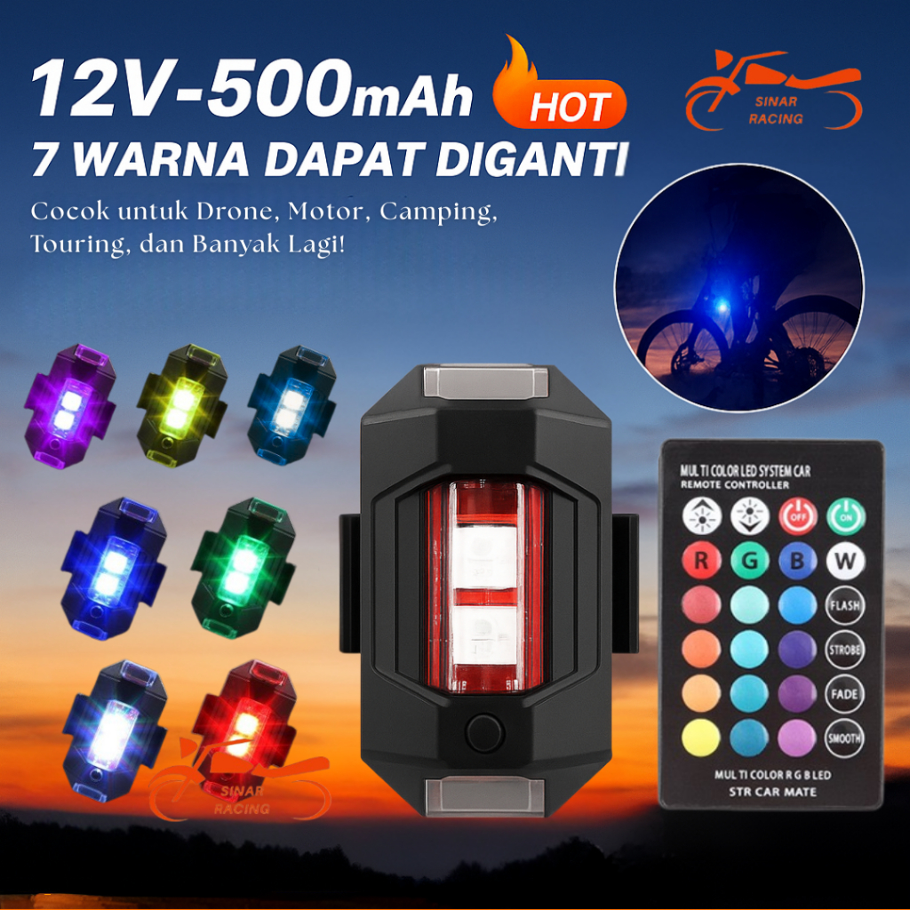 Sinar Rng Lampu LED Pesawat RGB 7 Warna Kedip — Paket 2 Lampu + 1 Remote USB, Strobo Universal untuk Motor & Mobil