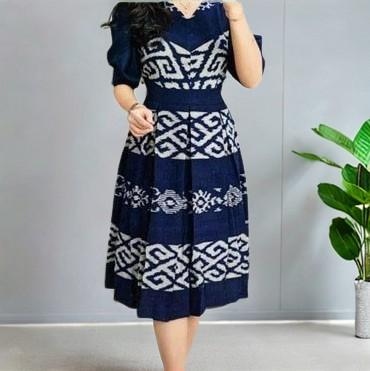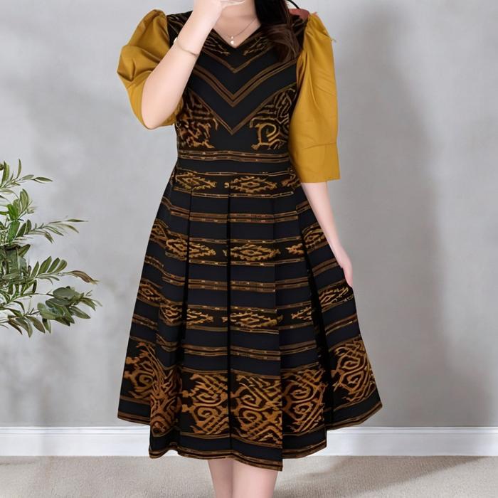 DRESS MIDI TENUN BATIK PREMIUM WANITA ELEGAN SETELAN WANITA MIDI DRESS MODEL TERBARU KEKINIAN - KUNING MAWAR, S