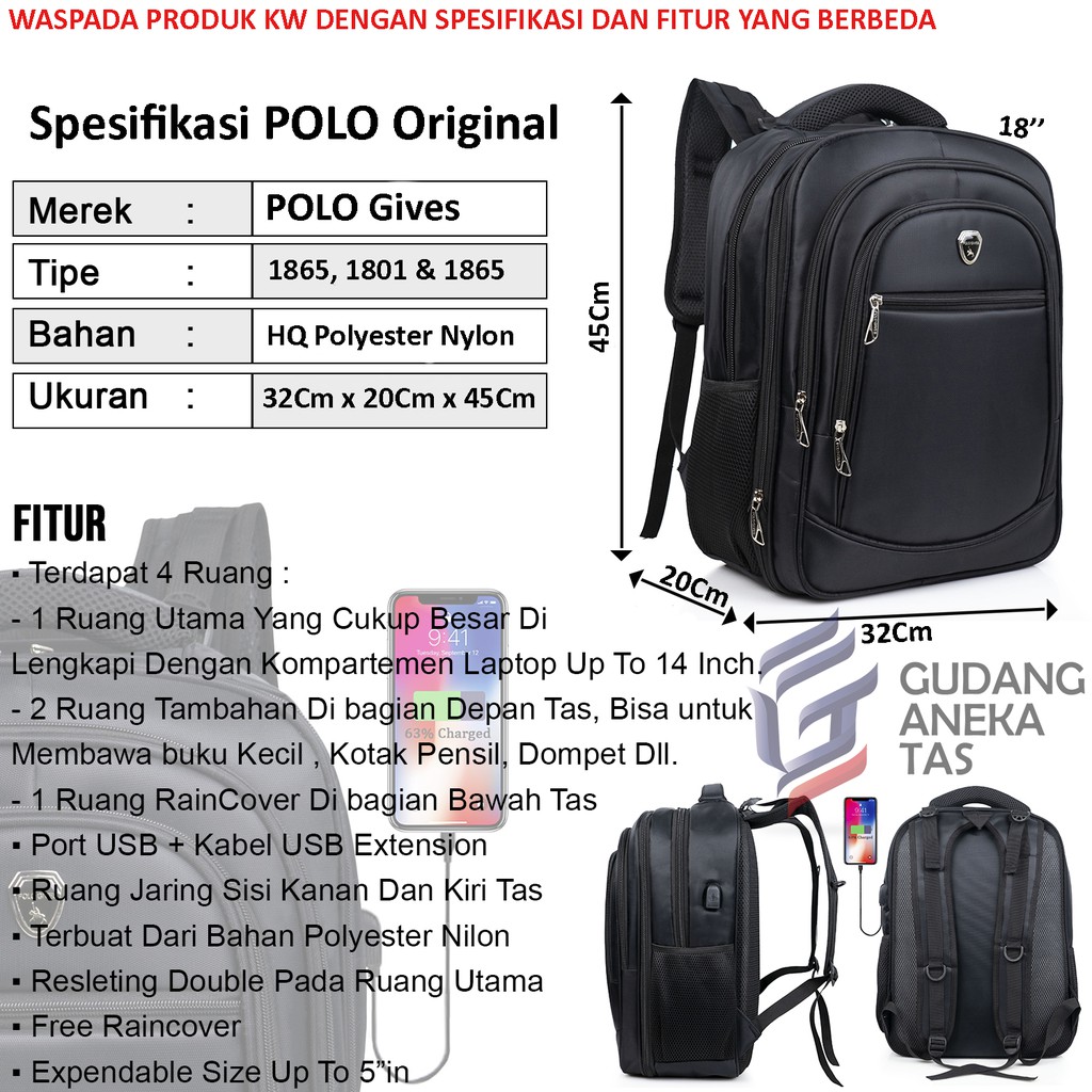 Tas POLO GIVES Tas Ransel POLO Original Import 18 Inch + Free Raincover + Free USB Ransel Sekolah IMPORT