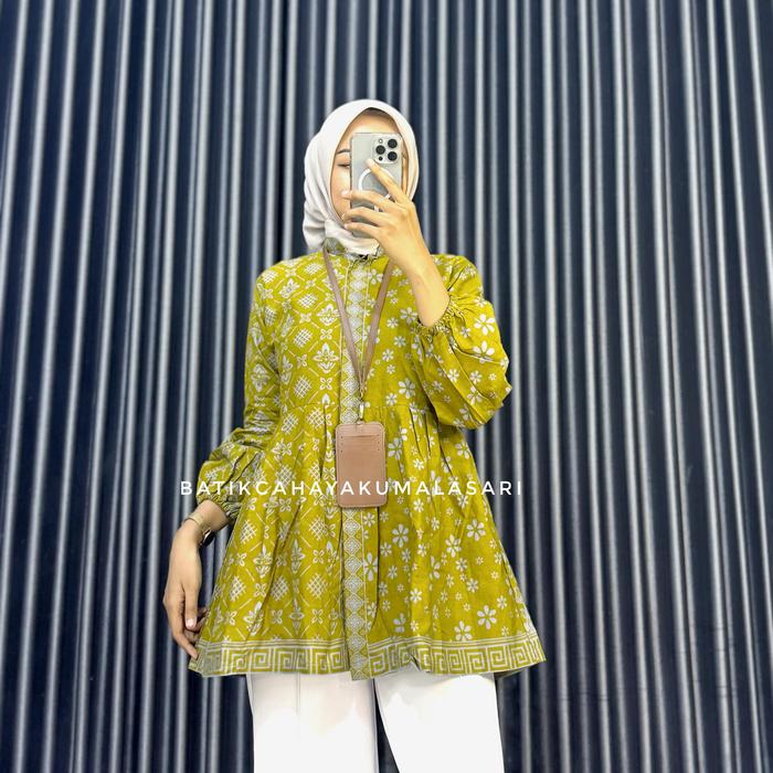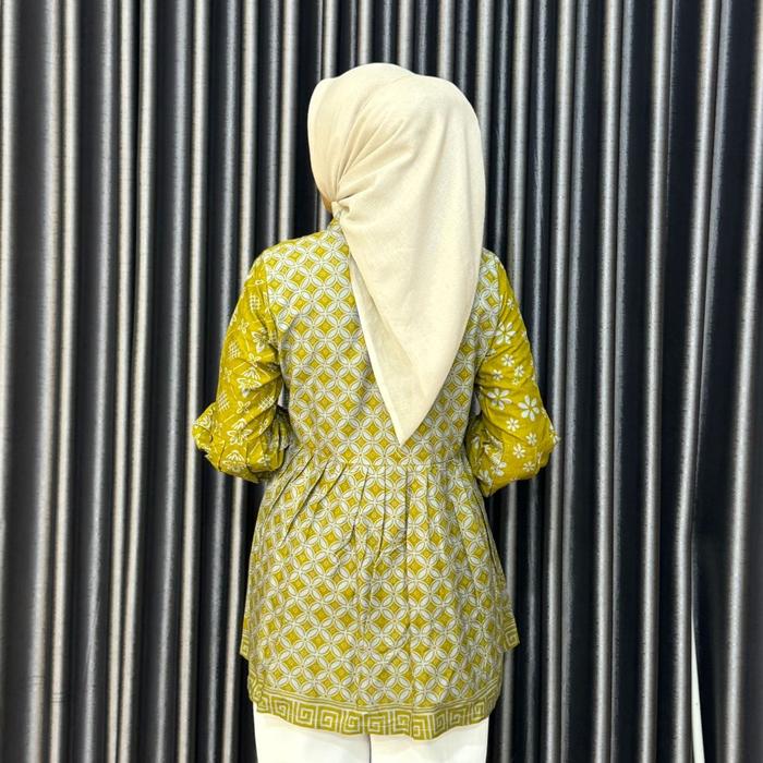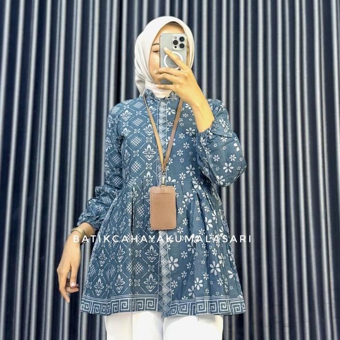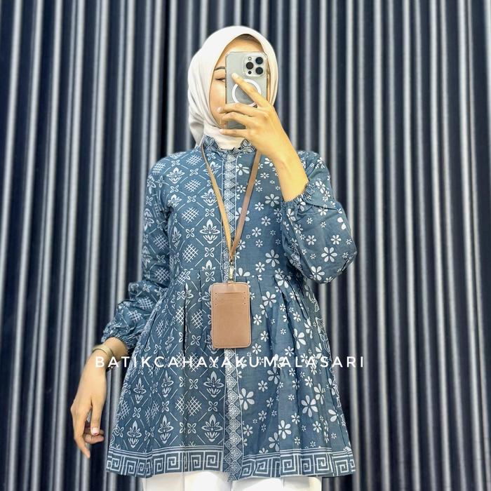 BLOUSE BATIK WANITA LENGAN BALON MOTIF ROMECCA - BAJU KERJA WANITA BAHAN KATUN PRIMA - BLUE DENIM, S