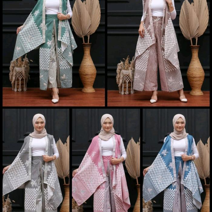 ONE SET OUTER VEST CELANA LAYER BATIK SETELAN CELANA PANJANG WANITA - GARIS ABU