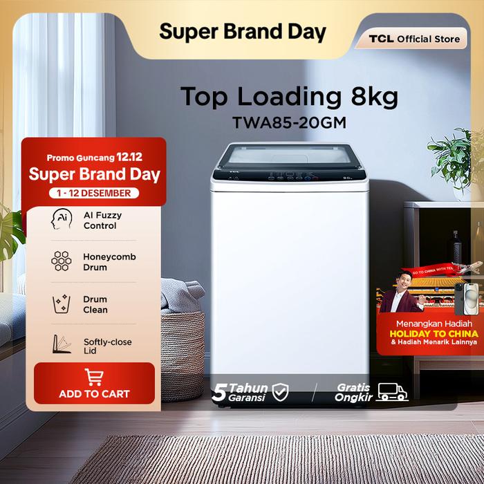 TCL Mesin Cuci 1 Tabung - Top Loading 8 KG - Honeycomb Crystal Drum - Auto Cleaning - Eight Wash
