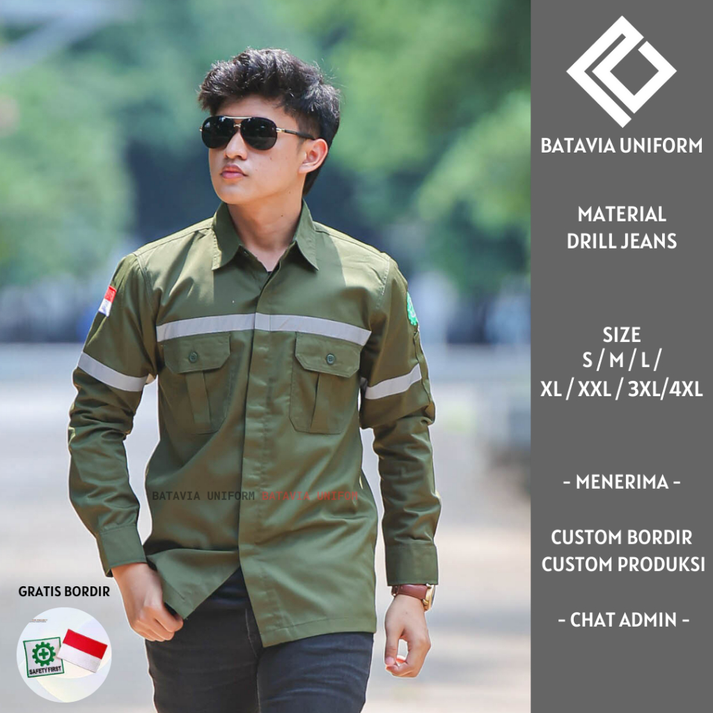 Baju Safety Wearpack K3 Army Green - Lengan Panjang Tambang, Custom Bordir, Pria Wanita