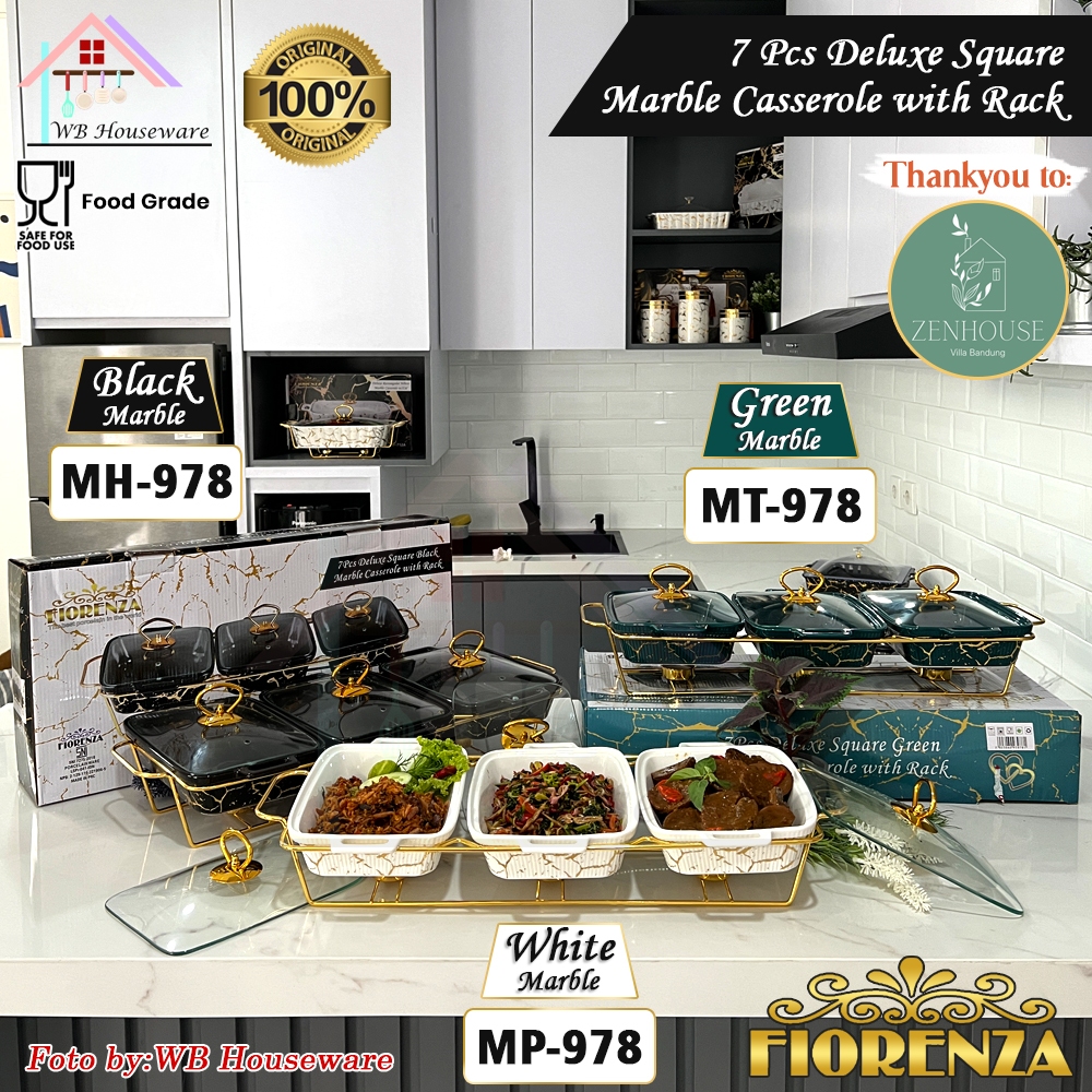 FIORENZA prasmanan set segi isi 3 + tutup + rak motif marble duluxe series keramik / premium casserole set with rack / food warmer type 978