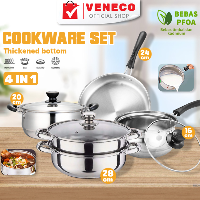 PANCI STAINLESS STEEL 4 Set Panci dan Wajan Stainless Steel / Panci Kukus 28cm Panci Sup 22cm, Panci Mie 18cm, Wajan 26cm