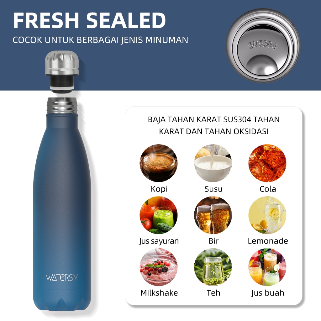 WATERSY Botol Termos 500ml Stainless Steel Double VacuumTahan Suhu 12 Jam, Cocok untuk GymSekolah.