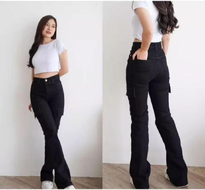 CELANA JEANS PANJANG CUTBRAY CARGO WANITA JUMBO KULOT CEWEK HIGHWAIST LOOSE STRETCH MELAR HITAM KARET DEWASA - GREY, 27