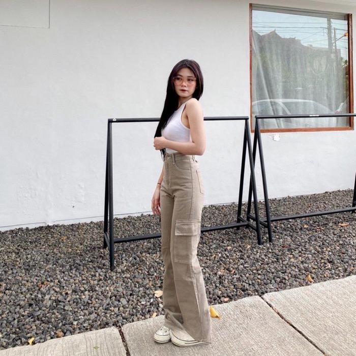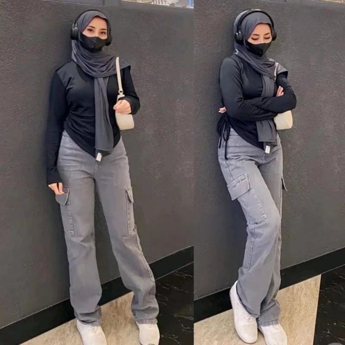 CELANA JEANS WANITA - HIGHWAIST CARGO JEANS WANITA - CELANA JEANS KARGO KANTONG SAMPING PREMIUM PANJANG CEWEK HITAM BAGGY - CARGO ABU, 27