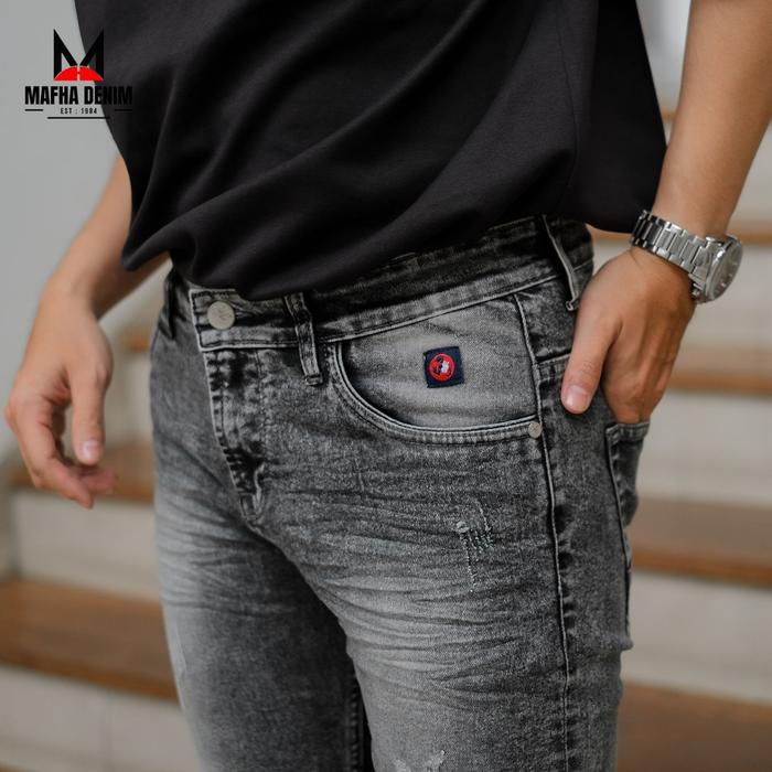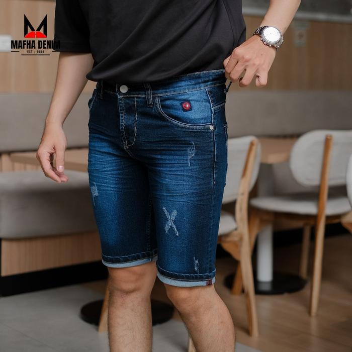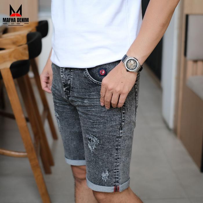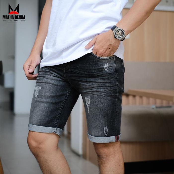 CELANA JEANS PENDEK SLIM FIT PRIA / SHORT RINGKEL / CELANA PENDEK DENIM DESTROY SOBEK PRIA STRETCH - SANDWASH RINGKEL, 27