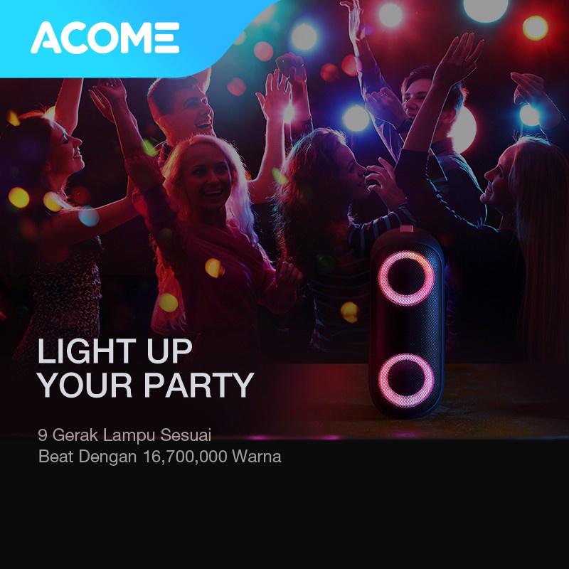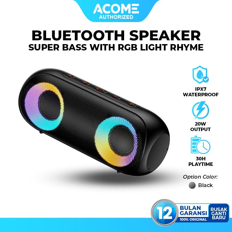 ACOME Super Bass Speaker Bluetooth 5.0 20W IPX7 Waterproof RGB Light Rhyme Rave Party A20