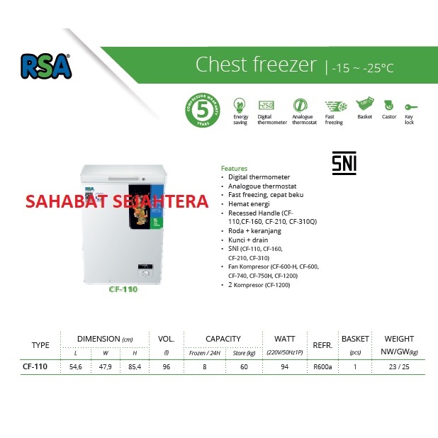 RSA Chest Freezer CF-110 Freezer Box Kap.96Liter