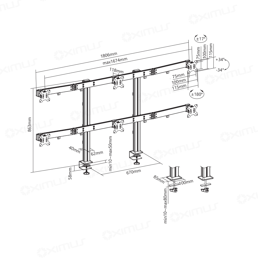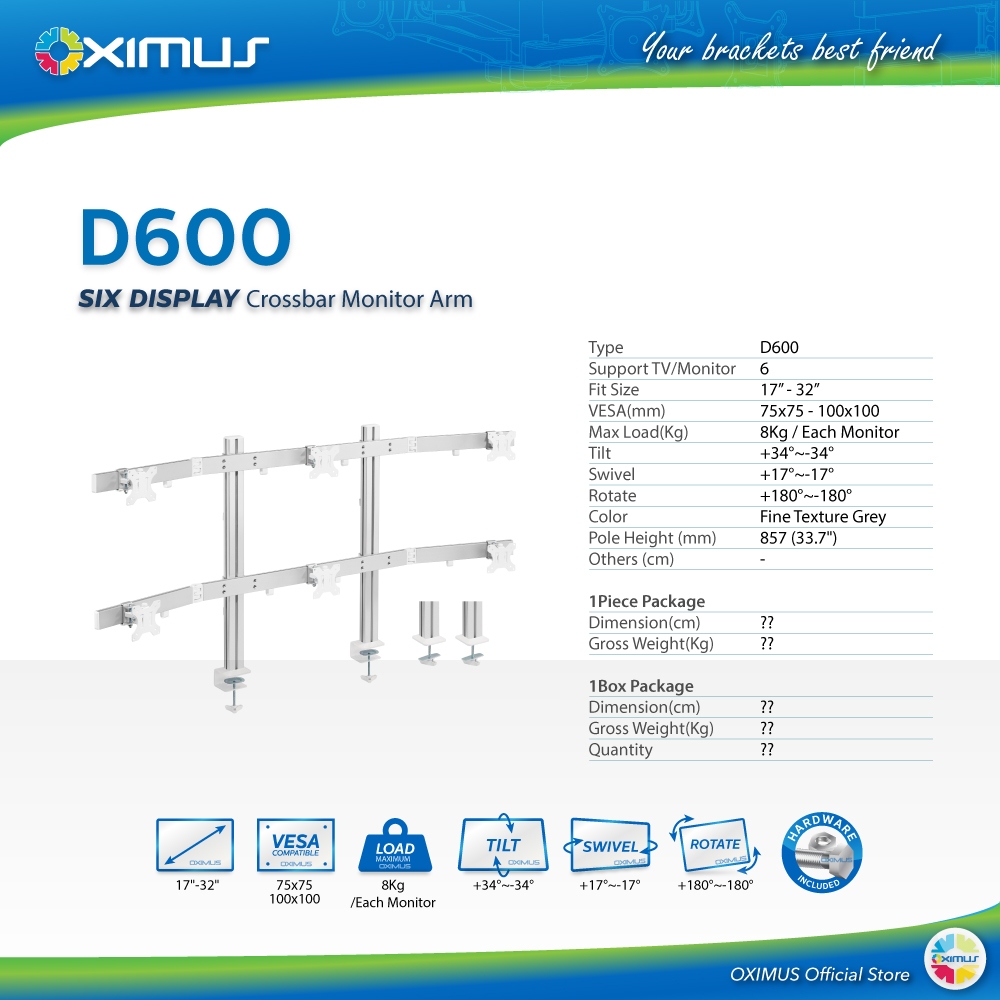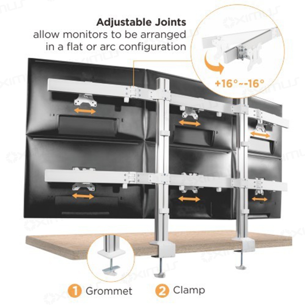 Oximus D600 Bracket meja jepit untuk 6 monitor 17" - 32" dengan bahan aluminium untuk kebutuhan HEAVY DUTY dan dilengkap