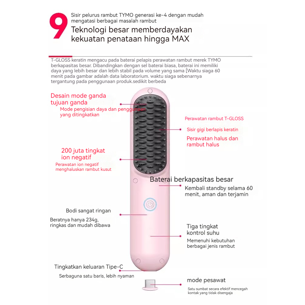 READY STOCK Fourth Generation TYMO PORTA Cordless Hair Straightener Brush, Mini Portable with USB Rechargeable, Negative