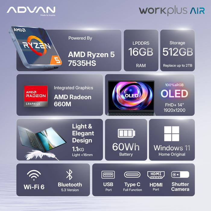 [Official Store ✔️] ADVAN Workplus Air Ryzen 5 7535HS 16GB/512GB 14" OLED Full HD+ Laptop Notebook Ultra Slim