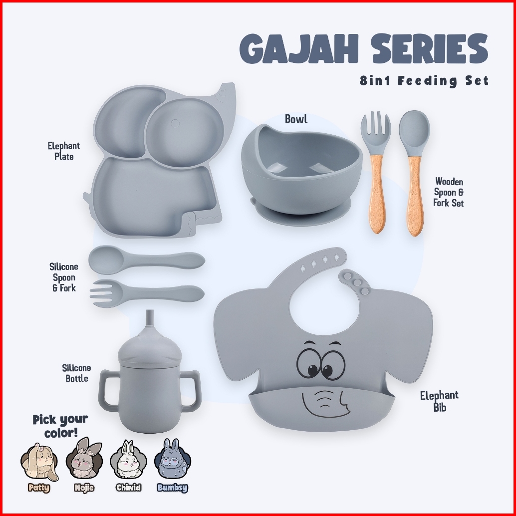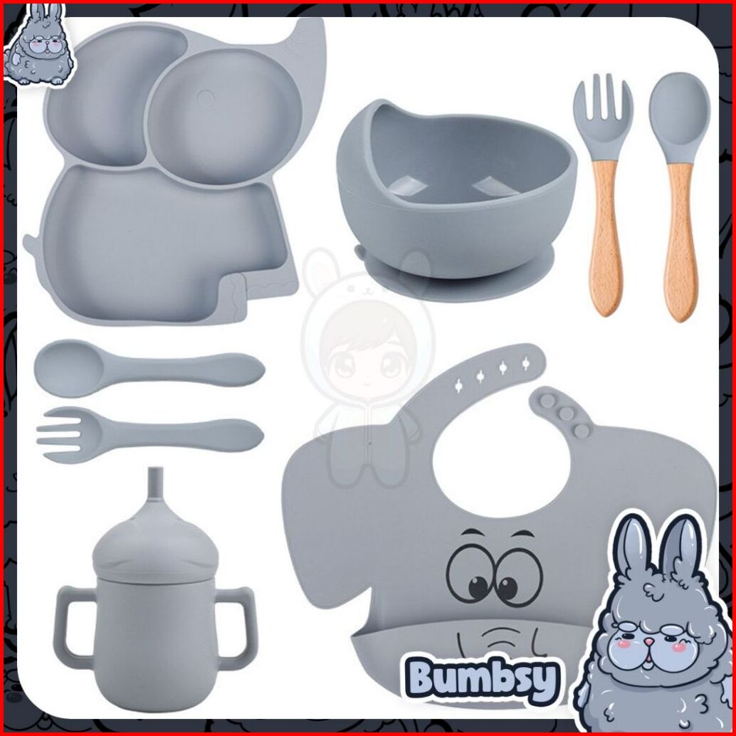 Bunnybaby - 8 In 1 Gajah Premium Feeding Set Silicone Gift Set Tempat Makan Bayi Baby Peralatan Makan Bayi Anti Slip Man