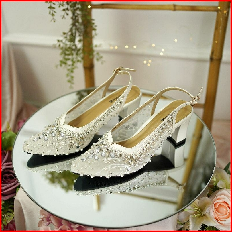 Deu Calantha Sepatu Pesta Wanita Wedding Shoes Berpayet Ankle Strap Aghnia Heels 5cm White 7cm Insole Empuk