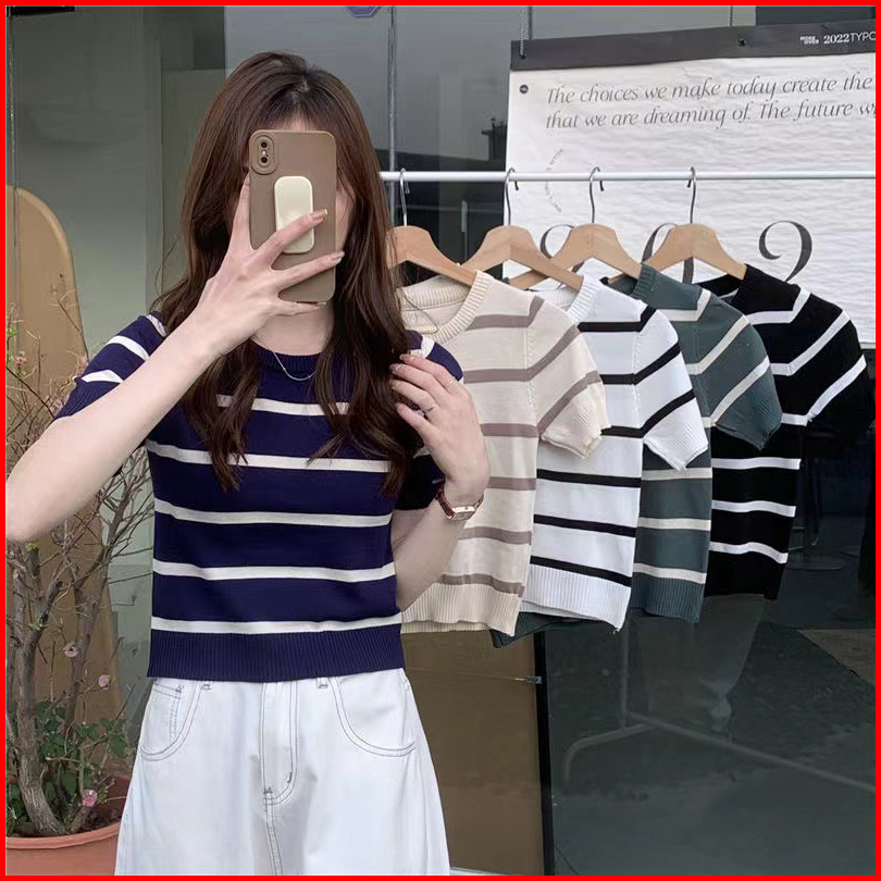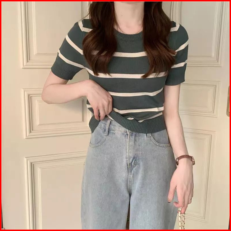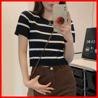 Atasan Rajut Crop Top Knit Wanita Strip Blaster Baju Wanita Crop Knit Lengan Pendek