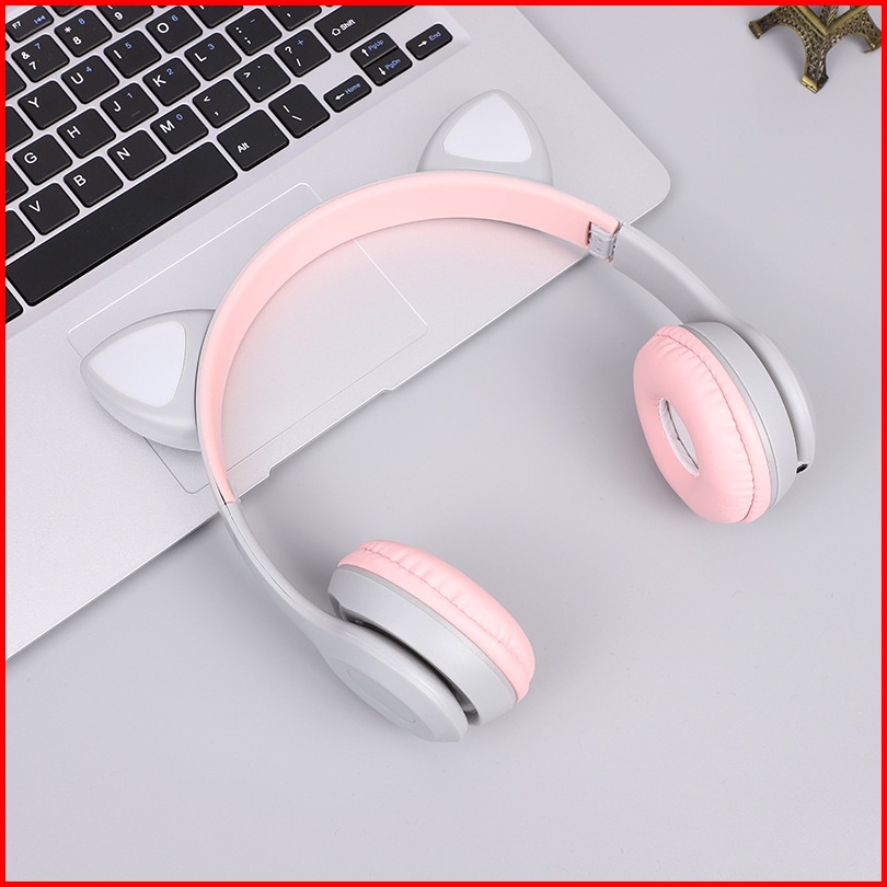 Peach - Headphone Telinga Kucing Lucu Led Wireless Headphone Bluetooth Headphone Wireless Light Bentuk Kucing 5422