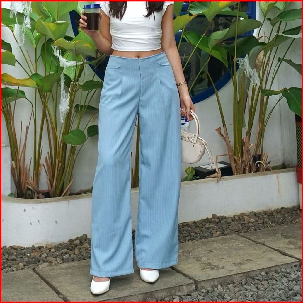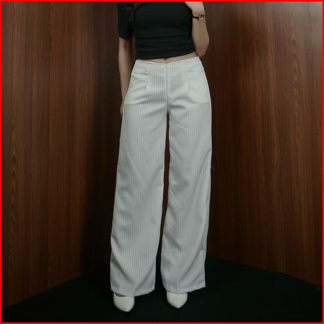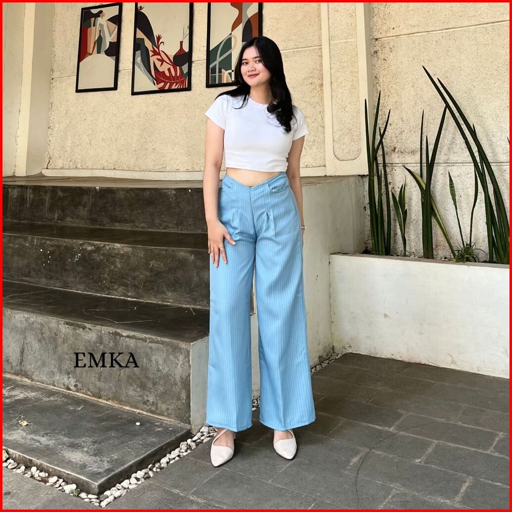 Emka City Pants Celana Stripe Wanita Warna Pink Model High Waist Material Nyaman Untuk Sehari-hari Desain Modern Panjang