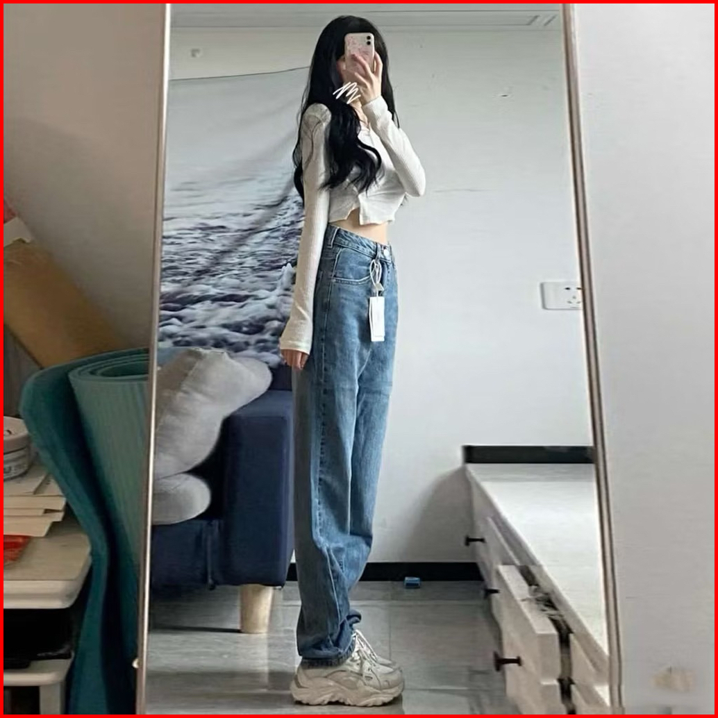 Celana Jeans High Waist Wanita Korean Style Jeans Baggy Pants Serbaguna Kasual Biru Retro