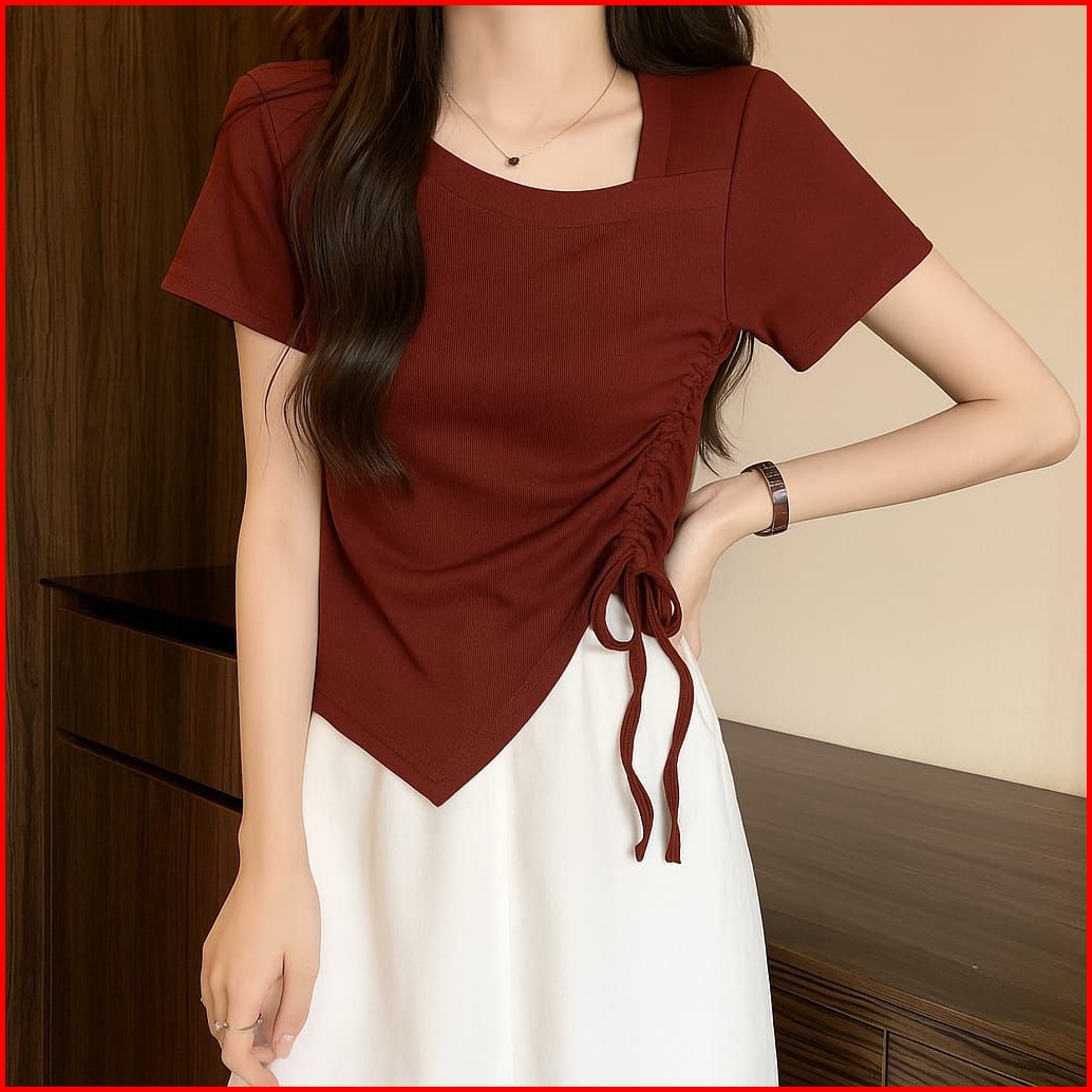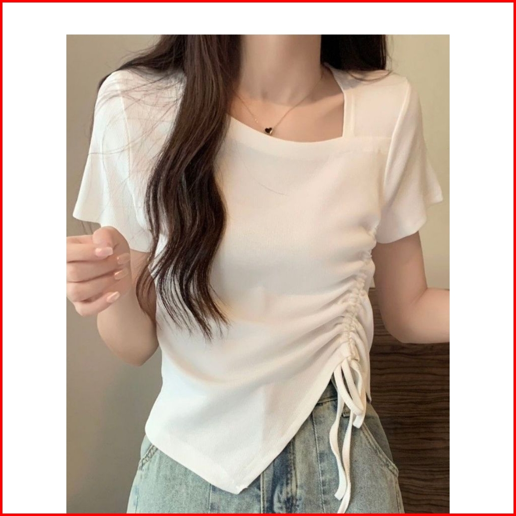 Atasan Wanita Terbaru Crop Top Square Neck Tali Serut Scrunch Rib Top Atasan Rib Serut Samping Kaos Wanita Lengan Pendek