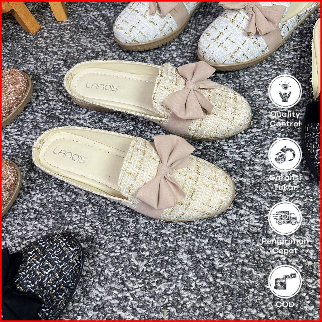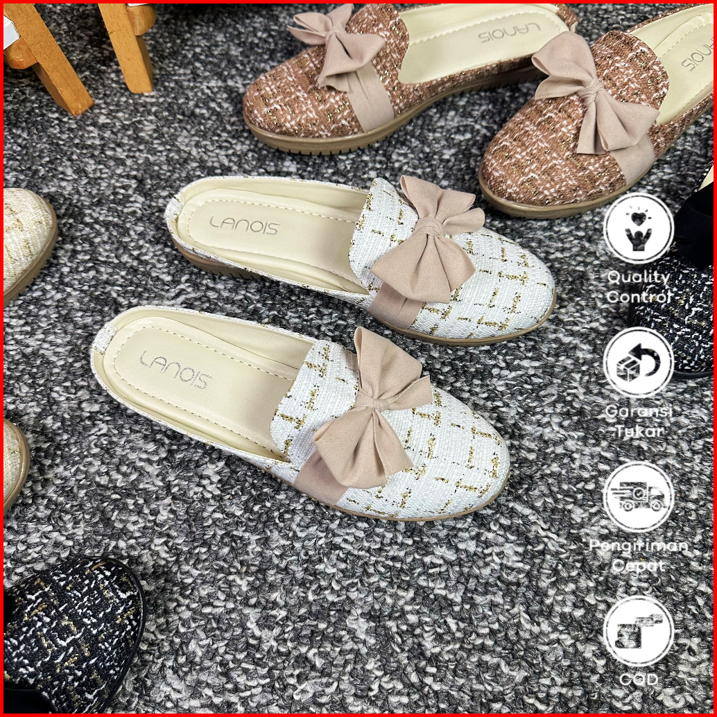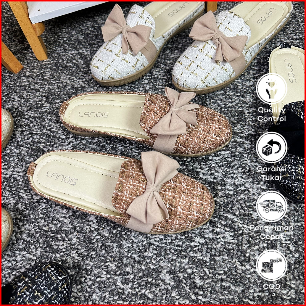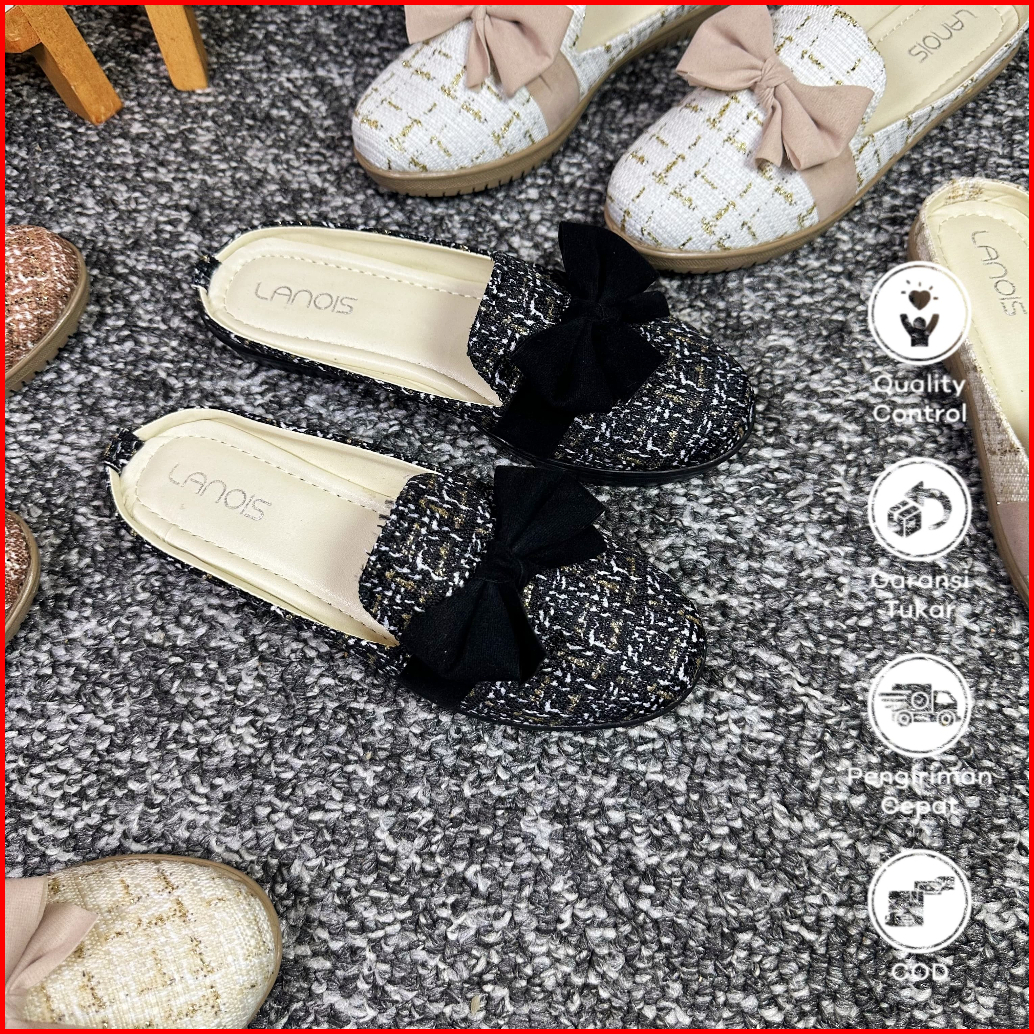 Lanois Sepatu Sandal Slip On Wanita Sepatu Flatshoes Pesta Sol Karet Anti Licin Motif Pita