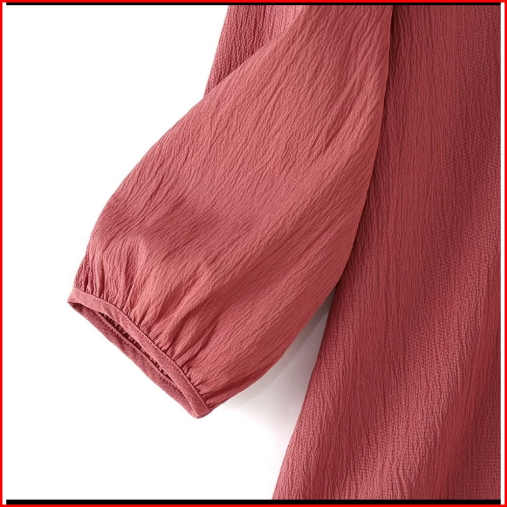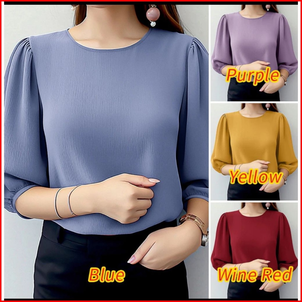 Blouse Wanita Warna Solid Leher Bulat Lengan Lentera Kemeja Kasual Longgar Untuk Natal